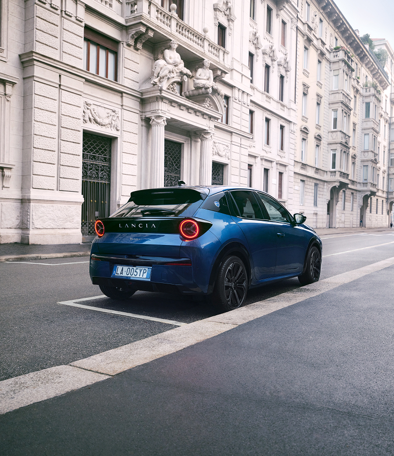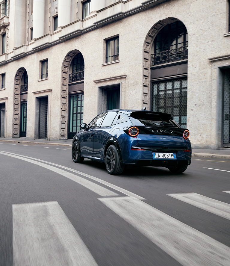 The front end reinterprets Lancia's historic grille: the chalice, with three LED beams that make the car recognizable both by day and night. In the rear, LED headlights are a clear homage to the Lancia Stratos, a rally legend.